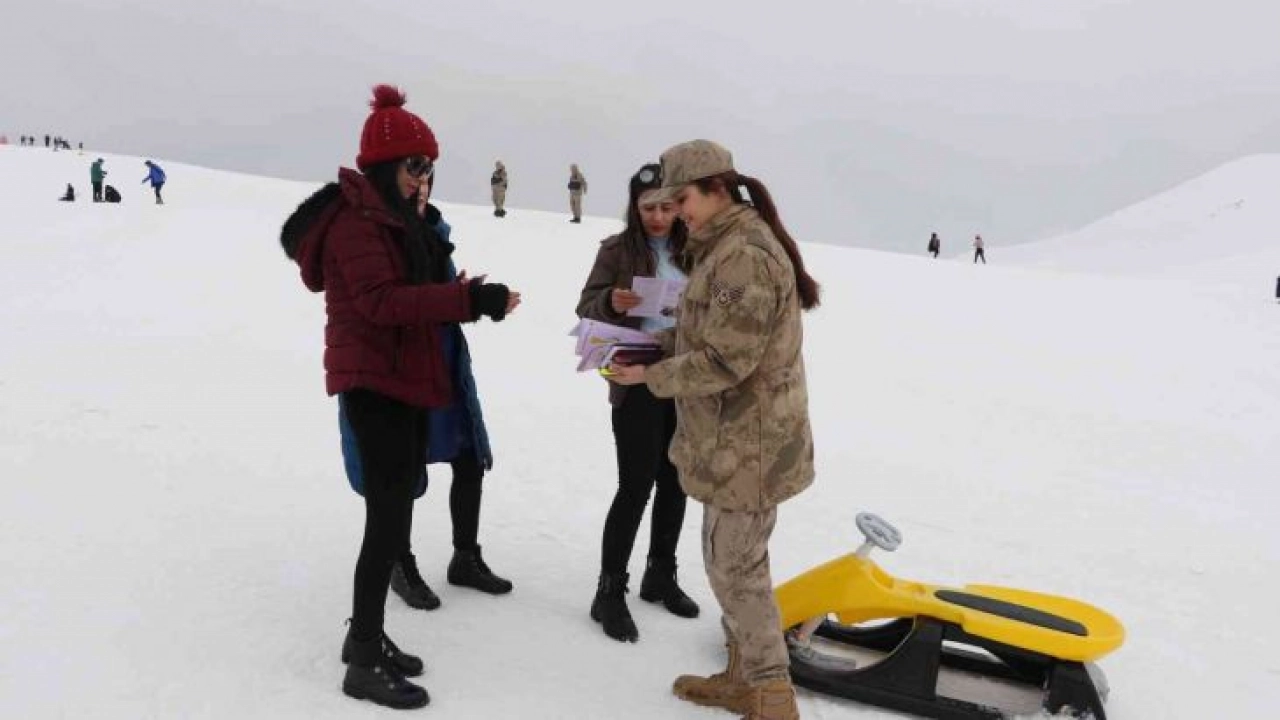 Bingöl'de Jandarma ekipleri, 2 bin 500 rakımlı Hesarek Kayak Merkezi'nde vatandaşlara KADES uygulamasını tanıttı.