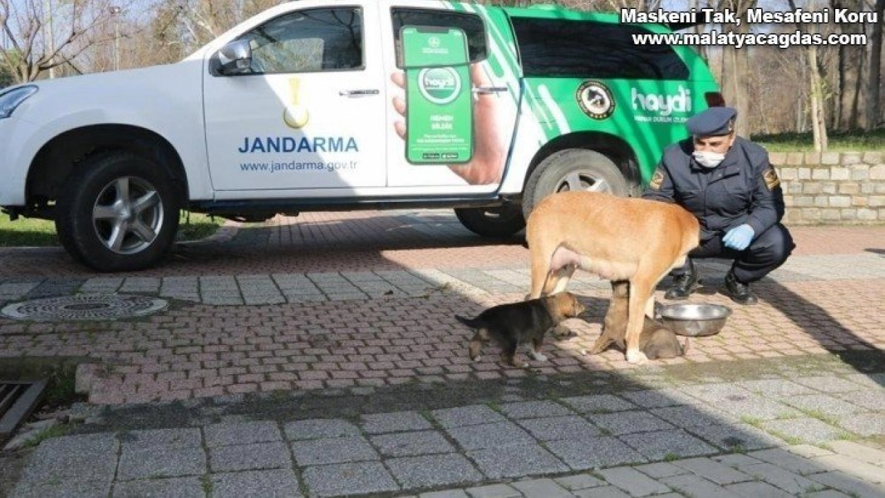 Balıkesir'in Gönen ve Manyas ilçelerinde jandarma ekipleri sokağa çıkma kısıtlamasında sokak hayvanlarına yem bıraktı.