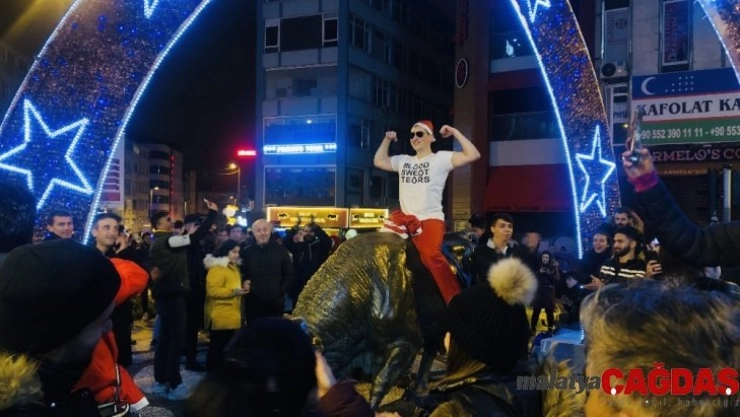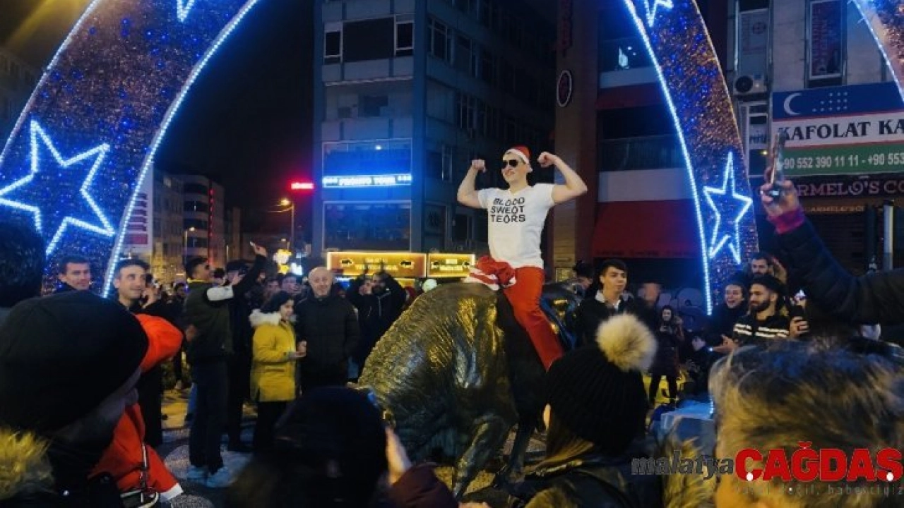 Boğa heykelinin orada toplanan bir grup vatandaş hep birlikte 10’dan geri sayarak 2020’ye girdi. Kimi vatandaşların boğanın üstüne çıkarak poz verirken kimi vatandaşlar ise da Noel baba kıyafeti giydikleri görüldü. Yoldan geçen araçlar ise korna çalarak yeni yılı kutladı. İki genç ise yeni yıla şınav çekerek girdi.