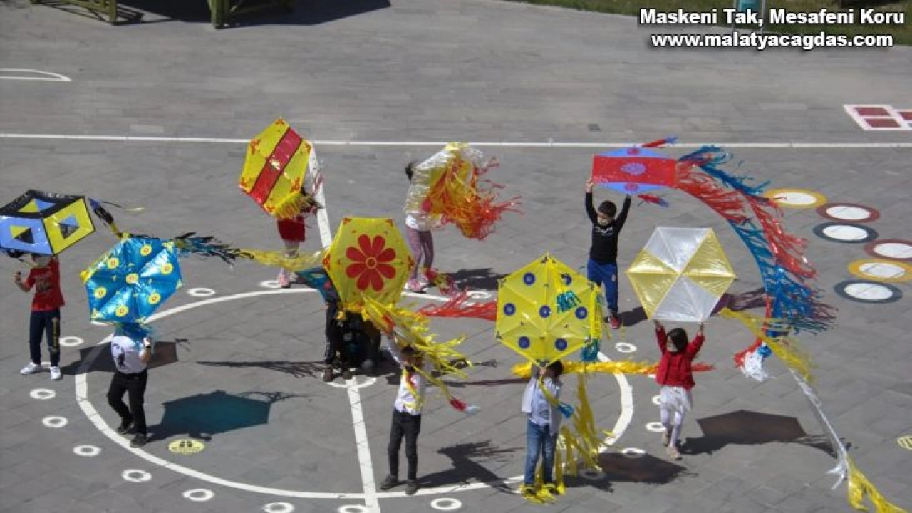 Adıyaman'ın Kahta ilçesinde Şehit Muhammet Fatih Safitürk İlkokulu öğrencileri 'Hayallerimi Gökyüzüyle Buluşturuyorum' projesiyle kendi yaptıkları uçurtmaları uçurarak renkli görüntüler oluşturdu.