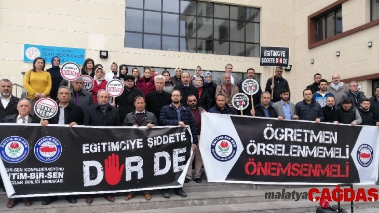 Eğitim Bir-Sen Kayseri Şube Başkanı Aydın Kalka, Kocasinan ilçesinde bulunan Şehit Bekir Çakır Ortaokulu’nda öğrenci velisi tarafından saldırıya uğrayan öğretmen için okul önünde öğretmenlerle birlikte basın açıklaması düzenledi. ’Öğretmenine değer ver’ ve ’Şiddete dur de’ yazılı dövizler açan öğretmenlerde Kalkan’a destek verdi.