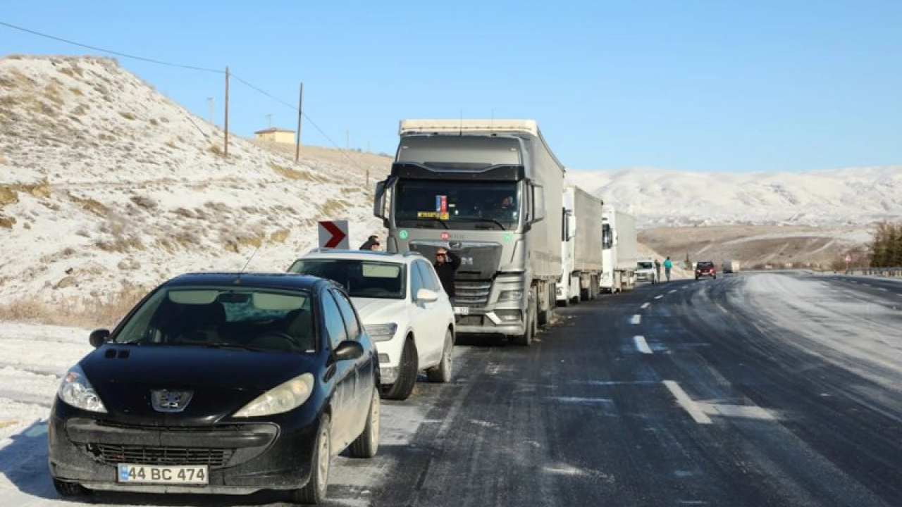 Darende ilçesi Balaban Mahallesi arasındaki D-300 kara yolunda etkili olan buzlanma nedeniyle kamyon, tır ve otobüs gibi araçlar yolda kaldı.