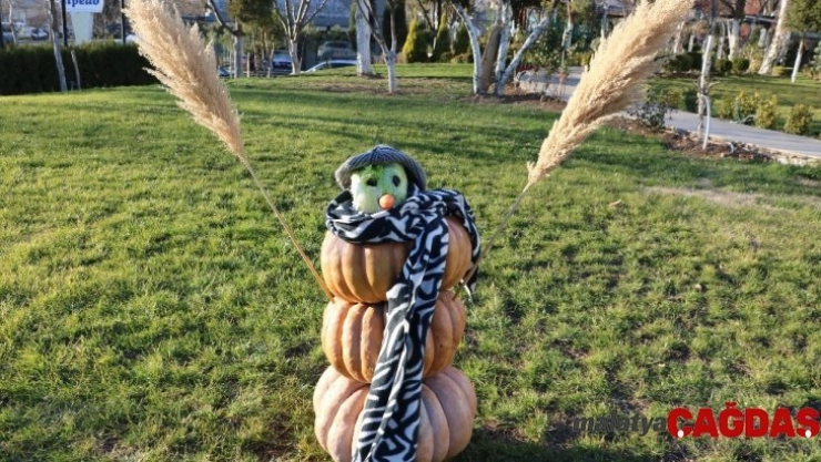 Kahramanmaraş'ta kent merkezine kar yağmayınca bir restoran çalışanları tarafından çocuklar için kabaktan adam yapıldı.