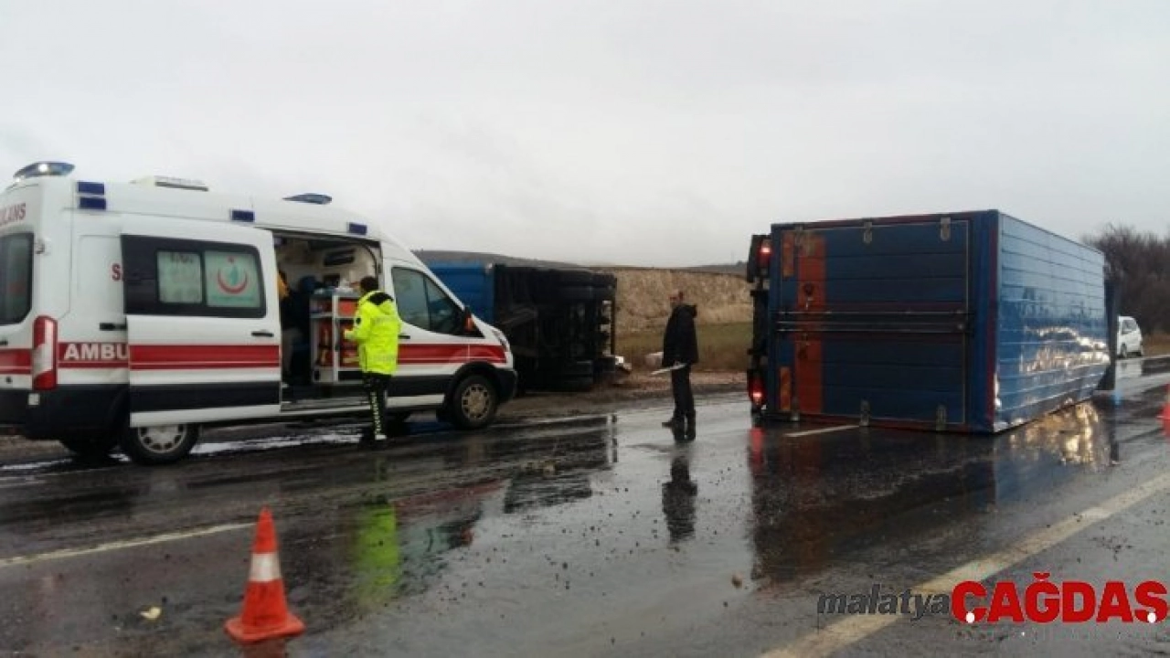 Çorum’da etkili olan yağmur nedeniyle kontrolden çıkan kamyonun devrilmesi sonucu meydana gelen trafik kazasında 2 kişi yaralandı.