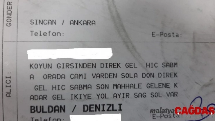 Denizli'nin Buldan ilçesinde PTT'ye gelen kargo paketindeki adres görevlileri şaşkına çevirdi. Alıcı kargosunu oturduğu adresi 'Köyün girişinden direk gel, hiç sapma, orada cami var' şeklinde belirtmesi ilçede günün konusu oldu.