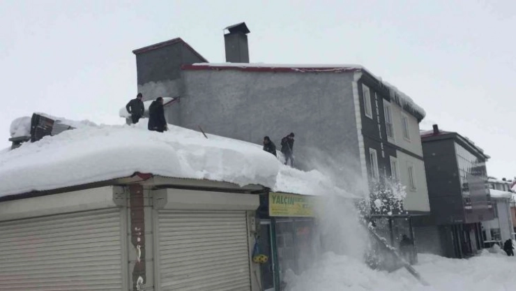 Bingöl'ün Karlıova ilçesinde esnaflar, çatılarda biriken ve neredeyse 1 metreye yaklaşan kar birikintilerini temizledi.