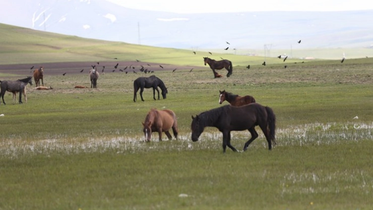 Kars'ın yeşeren doğasında yılkı atları görüntülendi