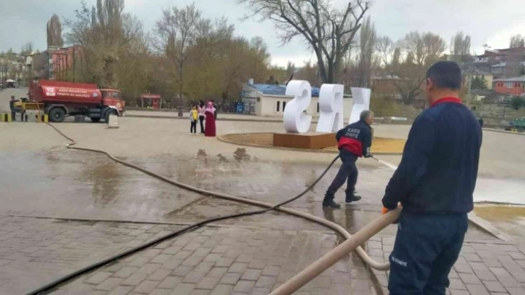 Kars'ta belediye ekipleri park ve bahçelerde bahar temizliği başlattı. Ekipler, parkaları tazyikli suyla yıkayarak temizliyor.