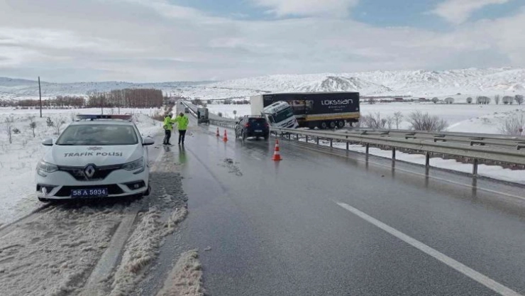 Sivas'ta yağan kar sonrası yolun kaygan oluşu nedeniyle kayan tır, karayolunu tek taraflı olarak araç ulaşımına kapattı.