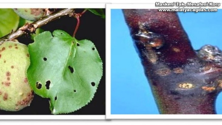 Çil hastalığının kayısı ağaçlarının yaprak, meyve, tomurcuk ve genç dalları üzerinde belirti oluşturduğuna işaret eden Macit, “Yaprak üzerinde oluşan lekeler ilkönce 1 mm çapında, yuvarlak, yağ lekesi görünümünde olup zamanla kenarlara kırmızımtırak, orta kısımları koyu kahverengine dönüşebilir. Bu lekeli kısımlar sonradan dökülür ve yaprakta delikler oluşur. Bazen birbirine bitişik lekeler birleşip dökülürler ve çapı 1 cm’yi bulan delikler görülür. Etmen yaprak saplarını da enfekte etmektedir. Genç sürgünlerde oluşan lekeler kısa sürede zamk çıkararak küçük kanser yaralarına dönüşürler” dedi.