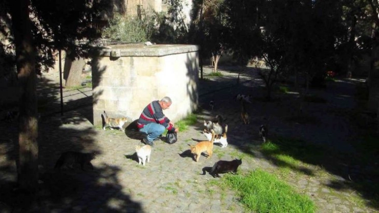Şanlıurfa’da yaşayan 45 yaşındaki Gaffar Kaymaz, yaklaşık 3 yıldır kent merkezindeki tarihi Ulu Cami bahçesinde kedi besliyor. Hayvanlara olan sevgisi nedeniyle her gün 60 TL’ye aldığı mama ile kedileri besleyen Kaymaz, herkesin takdirini kazandı. Hayvan sevgisi dolayısıyla kedileri beslediğini belirten Kaymaz, “Her gün gelip kedileri besliyorum. Yaklaşık 150 tane kedi var. Günde ortalama 2 ile 3 kilo arasında mama alıp getiriyorum. Ciğer falan olursa bağırsakları bozuluyor. Yaklaşık 3 yıldır bu işi yapıyorum. Hayvanları sevdiğim için her gün gelip besliyorum. Mamaya yaklaşık 60 lira para veriyorum. Şu anda çalışmıyorum boştayım. Hayvanları sevdiğim için, mama alabilmek için bir yerlerden para buluyorum. Benim dışımda birkaç arkadaş daha var, kedileri besleyen ama onlar ciğer getiriyor. Ciğer kedilerin bağırsaklarını bozuyor. O yüzden elimden geldiği kadar her gün kuru mama alıp getiriyorum. Belediyenin verdiği mamayı getirdim, onu yemiyorlar. Sonra geri onları çöpe döktük. Bende kendi imkanlarımla alıyorum” ifadelerini kullandı.
