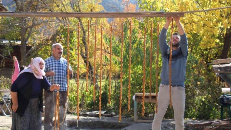 Üzüm şırasından hamur yoğrularak pişirilen ve ipe dizilen cevizleri içene batırıp yapılan el yapımı cevizli köme kış aylarında enerji deposu oluyor.