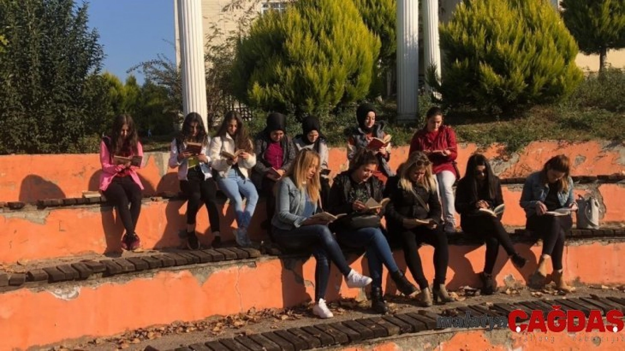 Düzce Zübeyde Hanım Mesleki ve Teknik Anadolu Lisesi öğrencileri 'Bir kütüphane, bin hapishane kapatır' ve Kitap Her yerde okunur sloganları ile oluşturdukları kitap okuma günlerine devam ediyor.