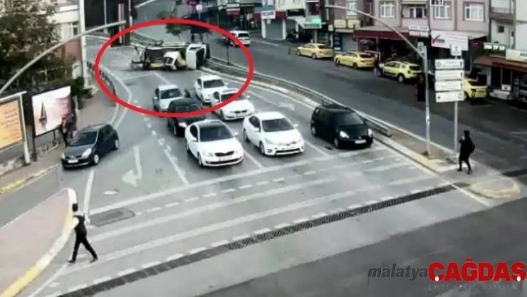 Feci kaza ise Mobese kameraları tarafından saniye saniye kaydedildi. Görüntülerde kırmızı ışıkta bekleyen 7 otomobilin arkasından hızla gelen vinç, freni patlayınca yola devrilerek savruluyor. Asfalt üzerinde hızla savrulan vinç duramayarak kırmızı ışıkta bekleyen araçların arasına dalıyor. Vincin çarpmasıyla savrulan araçlar hasar görürken yayalar ise korku ile kaçışıyor.