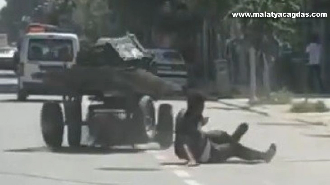 Şanlıurfa'da dizginleri düşen ve kontrolden çıkan atı durdurmak isteyen sürüsü düşerek at arabasının altında ezildi. Yüreklerin ağızlara geldiği olayda at ve sürücü yara almazken o anlar bir vatandaş tarafından cep telefonuyla kaydedildi.