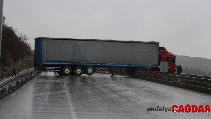 Manisa’nın Kula ilçesinde seyir halinde olan bir tır, yağışlı havanın etkisiyle sürücüsünün direksiyon hakimiyetini kaybetmesi sonucu refüjle bariyerler arasında sıkıştı.
