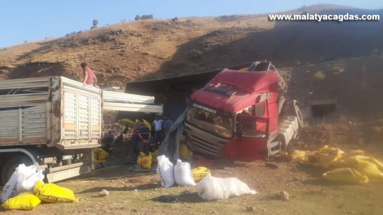 Tırın kaza yapmasıyla birlikte yemler yola savrulurken, sürücü yara almadan kazayı atlattı.