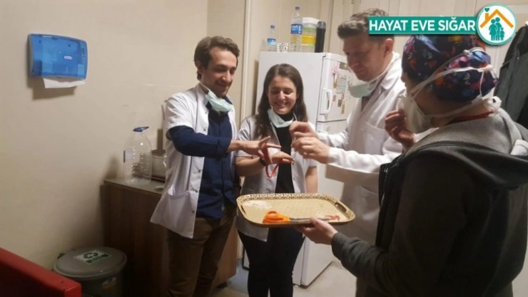 Arkadaşları tarafından yapılan temsili nişan töreninin kendisini mutlu ettiğini belirten Dr. Kardelen Turan, kuyumcular kapalı olduğu için alyanslarını alamadıklarını ve eldivenden yüzük yaptıklarını söyledi. Turan, “Kuyumcular açık olmadığı için alyanslarımızı dahi alamadık. Pazartesi günü nikah planlıyoruz. Ailelerimiz uzakta olduğu için isteme törenimizi yapamadık o yüzden iş arkadaşlarımız bize ailelerimiz gibi temsili bir nişan töreni yaptılar. Bizim de içimizde kalmamış oldu, çok mutlu olduk. Çalışmalarımıza devam ediyoruz, hastalarımız için. Bu sürecinden olumlu sonuçlanacağına inanıyoruz. Birkaç ay içerisinde bu süreç sonuçlanacak ve herkes eski hayatına dönebilecek diye umut ediyorum. Kendimizi de bu süreçte olabildiğince dikkat ediyoruz. Bizim ilişkimiz acil serviste başladı. Zamanımızın çoğu acil serviste geçiyor, bizim için hiç sıkıntı değil. Hatta gelecek için çok güzel bir hatıra oldu” dedi.