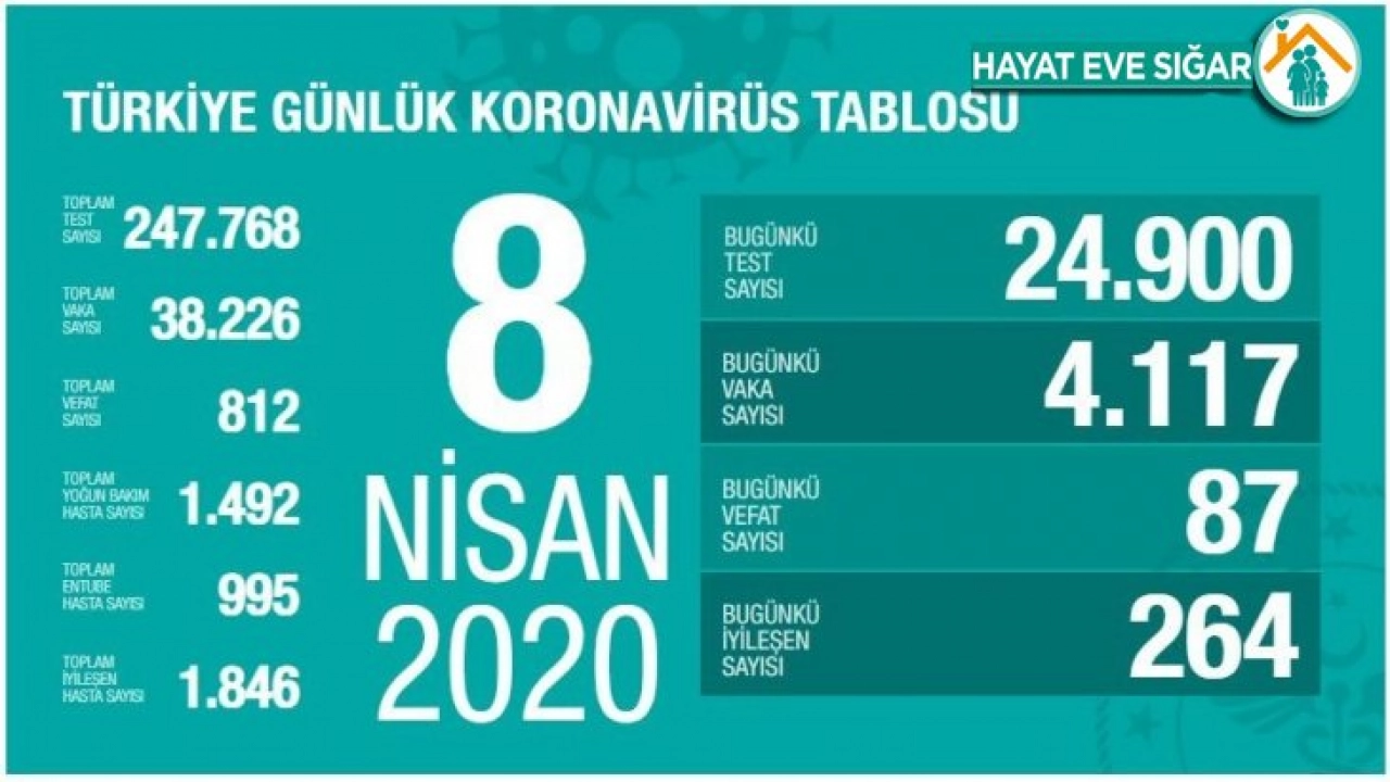 Sağlık Bakanlığından yapılan açıklamaya göre, korona virüs nedeniyle son 24 saatte 87 kişinin hayatını kaybetmesiyle can kaybı 812’ye yükseldi. Bugün 24 bin 900 kişiye test yapılırken, 4 bin 117 kişiye Kovid-19 tanısı konuldu. Toplam vaka sayısı da 38 bin 226 oldu. Bugün iyileşen 264 kişi ile birlikte toplam taburcu sayısı ise bin 846’ya ulaştı.