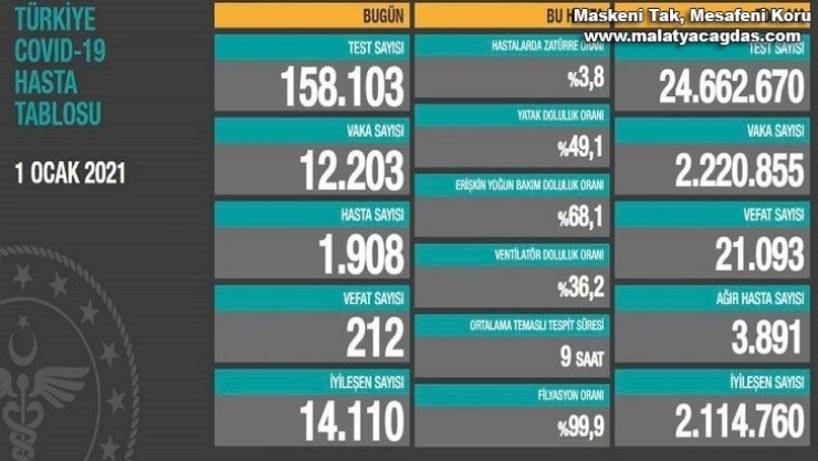 Sağlık Bakanlığının Covid-19 bilgilendirme sayfasında Türkiye’nin güncel korona virüs tablosu kamuoyuyla paylaşıldı. Tabloya göre son 24 saatte 212 kişi korona virüsten hayatını kaybetti, toplam can kaybı 21 bin 93’e yükseldi. Toplamda 24 milyon 662 bin 670 test yapıldı. Bugün yapılan 158 bin 103 testten, 12 bin 203 yeni vaka sayısı, bin 908 de yeni hasta sayısı olduğu belirtildi. Toplam vaka sayısının 2 milyon 220 bin 855 olduğu, bugün iyileşen kişiyle 14 bin 110 birlikte toplam iyileşen hasta sayısının 2 milyon 114 bin 760’ ye yükseldiği, toplam hastalarda zatürre oranının yüzde 3,8, ağır hasta sayısının ise 3 bin 891 olduğu açıklandı.
