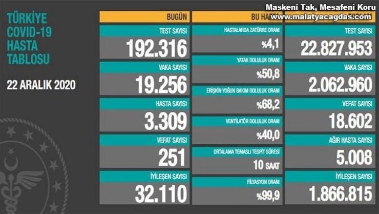 Sağlık Bakanlığının Covid-19 bilgilendirme sayfasında Türkiye’nin güncel korona virüs tablosu kamuoyuyla paylaşıldı. Tabloya göre son 24 saatte 251 kişi korona virüsten hayatını kaybetti, toplam can kaybı 18 bin 602’e yükseldi. Toplamda 22 milyon 827 bin 953 test yapıldı. Bugün yapılan 192 bin 316 testten, 19 bin 256 yeni vaka sayısı, 3 bin 309 kişinin de hasta vaka olduğu belirtildi. Toplam vaka sayısının 2 milyon 62 bin 960 olduğu, bugün iyileşen 32 bin 110 kişiyle birlikte toplam iyileşen hasta sayısının 1 milyon 866 bin 815’e yükseldiği, toplam hastalarda zatürre oranının yüzde 4,1, ağır hasta sayısının ise 5 bin 8 olduğu açıklandı.