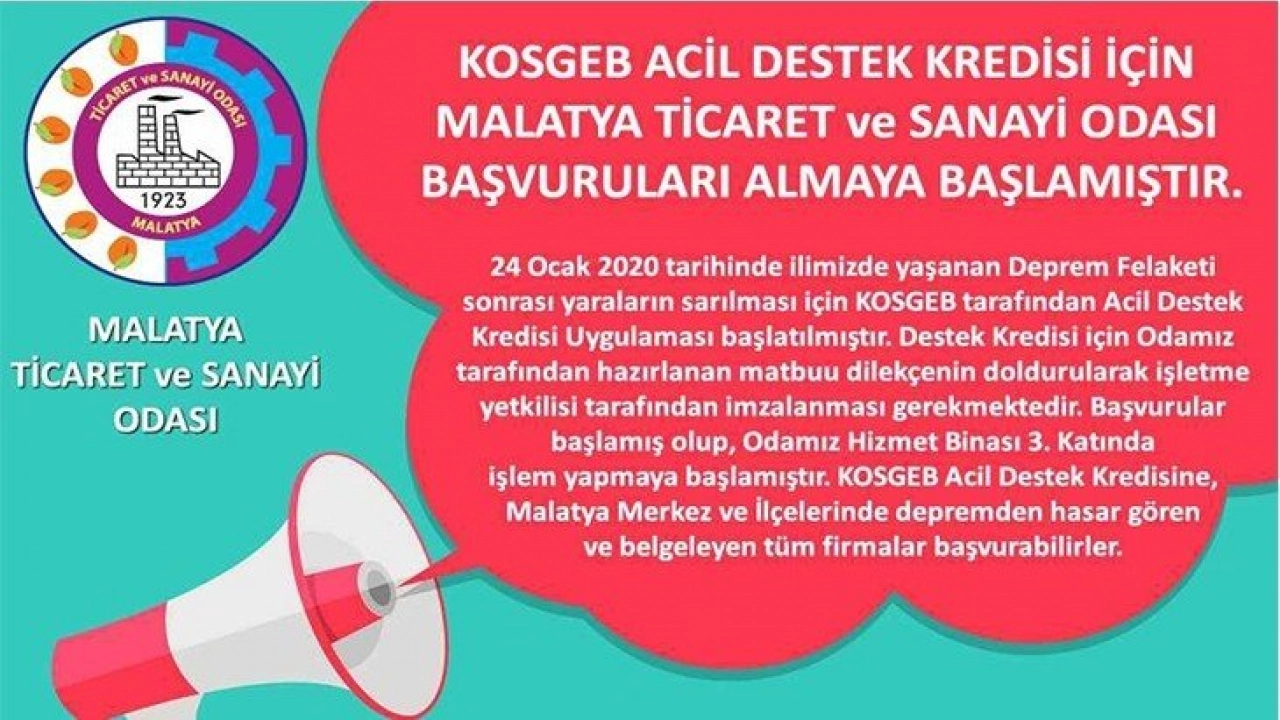 Malatya Ticaret ve Sanayi Odası (MTSO) tarafından yapılan açıklamada, “KOSGEB acil destek kredisi için MTSO’ya müracaatlar başlamıştır. 24 Ocak 2020 tarihinde yaşanan deprem felaketi sonrası yaraların sarılması için KOSGEB tarafından Acil Destek Kredisi uygulaması başlatılmıştır. Destek Kredisi için odamız tarafından hazırlanan matbu dilekçenin doldurularak işletme yetkilisi tarafından imzalanması gerekmektedir. Müracaatlar başlamış olup, odamız hizmet binasının 3.katında işlem yapılmaya başlanmıştır. KOSGEB Destek Kredisi Kredisine, Malatya merkez ve ilçelerde depremden hasar gören ve belgeleyen tük firmalar başvurabilir” ifadeleri kullanıldı.