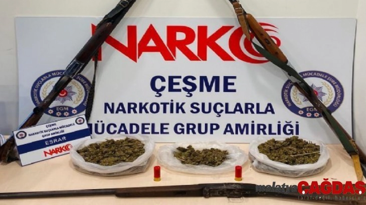İzmir'in Çeşme ilçesinde Narkotik ekipleri gerçekleştirdiği operasyonda bir kişinin kümesinde 485 gram esrar ele geçirdi.
