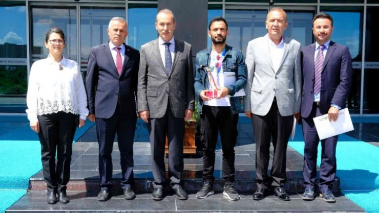Hatay Mustafa Kemal Üniversitesi’nin ev sahipliğinde düzenlenen “19. Üniversiteler Halk Müziği ve Halk Dansları Yarışmaları”nda 3’üncü olan SCÜ Halk Dansları Ekibi ile organizasyonun solo ses yarışmalarında 3’üncü olan Ayhan Şanlı, Rektör Prof. Dr. Alim Yıldız’ı ziyaret ederek kupaları takdim etti.