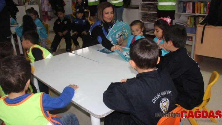 Masal kitabı dağıtılan çocuklar bir taraftan kitaptaki boyama kısımlarını boyama başlarken, polis memuru Semra Ağaya çocuklara masallar okudu.