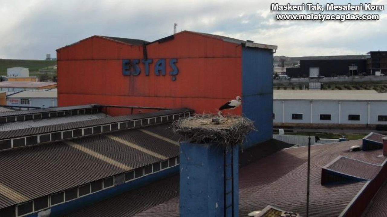 Dünya’da kam mili üretiminde ilk sıralarda yer alan, Türkiye’nin önemli ağır sanayi kurulularından biri olan ESTAS, son 15 yıldır olduğu gibi bu yıl da göçmen bir leylek ailesine ev sahipliği yapıyor. Leylek ailesi Baharın gelmesi ve havaların ısınması ile fabrika bacalarından birinde kurmuş oldukları yuvalarına geri döndü. Firma yetkilileri geçtiğimiz yıllarda olduğu gibi bu yılda leyleklerin zarar görmemesi için, bacanın bulunduğu dökümhanede faaliyete ara verdi. Kendileri için en uygun yaşam alanı olarak fabrika bacasını seçen leylekler havadan görüntülendi. Leyleklerin halinden memnun oldukları gözlendi.