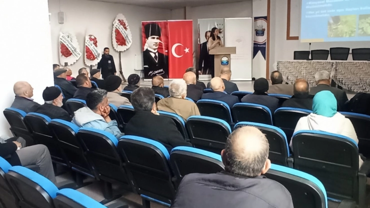 Kale Belediyesi Toplantı Salonunda gerçekleştirilen eğitim programında Ziraat Mühendisi Şevket Fidan, meyve bahçelerinde zirai ve biyolojik mücadele, gübreleme, sulama, ilaçlama ile ilkbahar bahçe bakımı gibi konularında çiftçilere bilgi verdi.