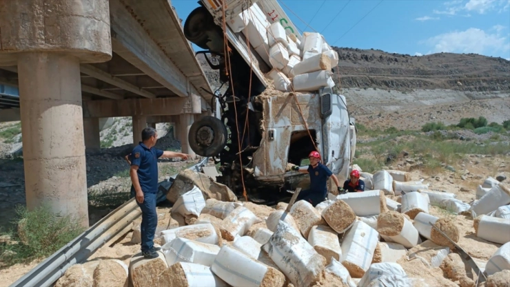 Yakup Ç. idaresindeki 80 ADJ 074 plakalı saman balyası yüklü tır, Yazıhan ilçesine bağlı Akyazı Mahallesi Sarsap Tüneli çıkışındaki köprüde çelik bariyerleri aşarak devrildi.