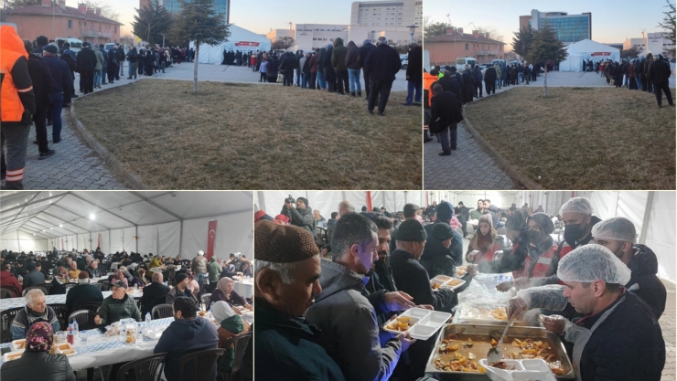 Malatya Eğitim ve Araştırma Hastanesinde uzun kuyrukların oluştuğu çadırlarda, iftar yemeklerini alan vatandaşlar masalara oturarak akşam ezanının okunmasını bekledi.