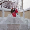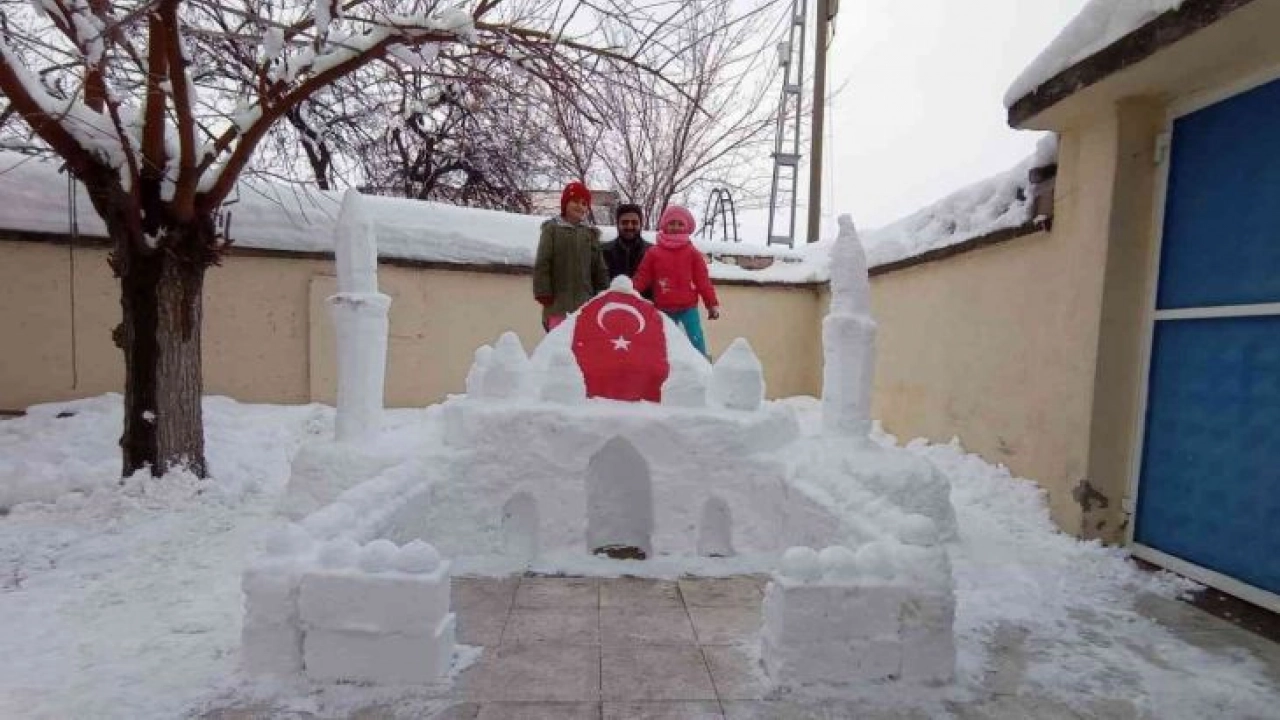 Yoğun kar yağışının devam ettiği Malatya'da tatili fırsat bilen baba ve kızları kardan cami yaptı