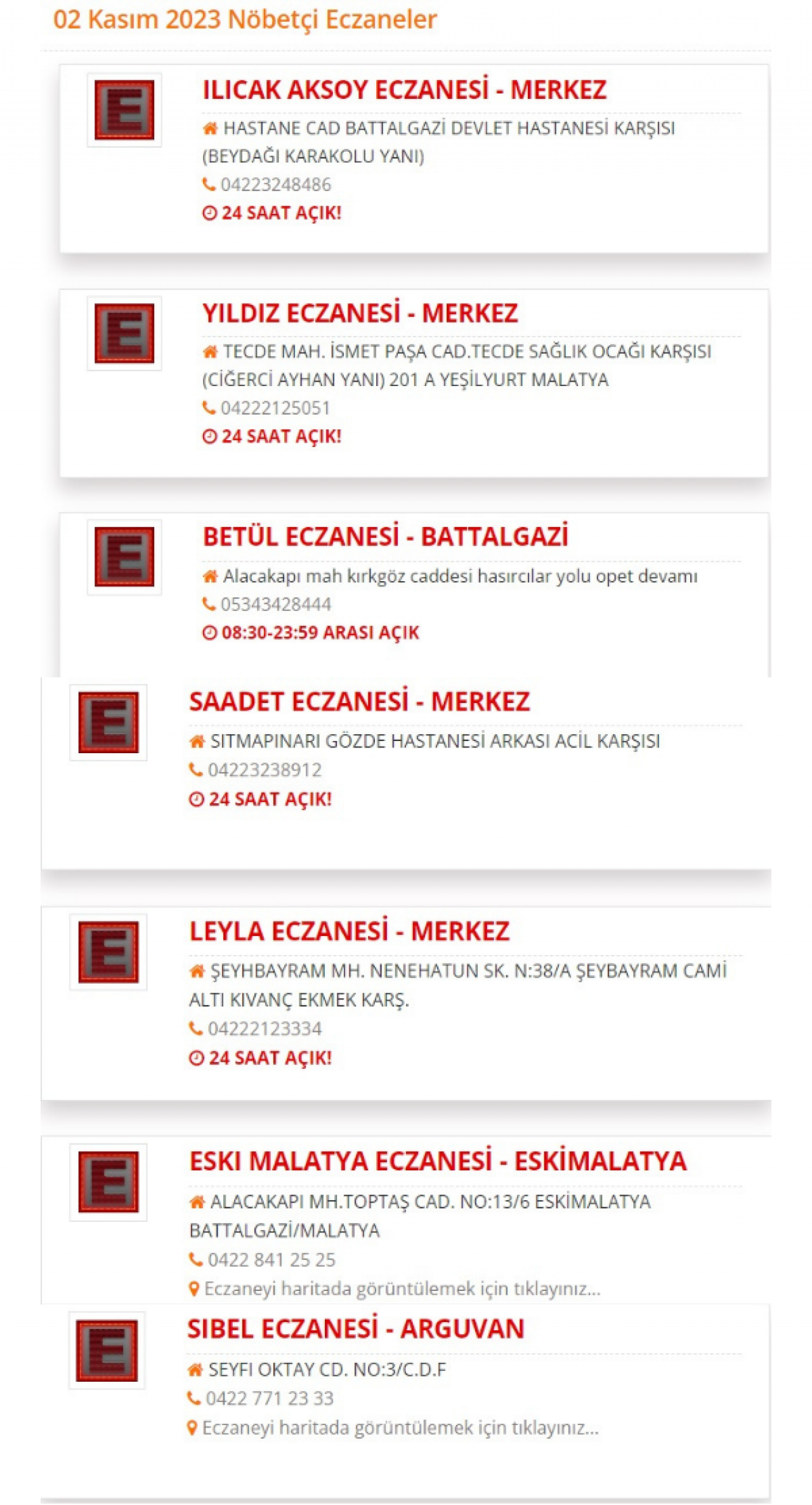 Malatya Eczacılar Odası 01,11, 2023 perşembe Günü Nöbetci Eczane Listesi