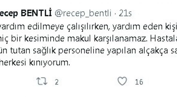 Bu arada, Malatya İl Sağlık Müdürü Prof. Dr. Recep Bentli de sosyal medyasında yaptığı açıklamada, saldırıyı kınayıp, “Kendisine yardım edilmeye çalışılırken, yardım eden kişiye şiddet uygulamak toplumun hiç bir kesiminde makul karşılanamaz. Hastalarımızın sağlığını her şeyden üstün tutan sağlık personeline yapılan alçakça saldırıyı ve şiddet uygulayan herkesi kınıyorum. Sağlık personelimize geçmiş olsun dileklerimi sunuyor; sağlıkta şiddetin sona ermesini temenni ediyorum“ ifadelerine yer verdi.