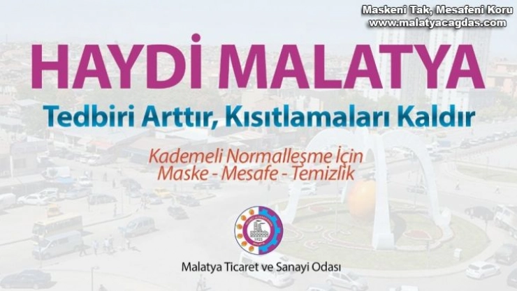 Malatya Ticaret ve Sanayi Odası Başkanı Oğuzhan Ata Sadıkoğlu, sosyal medyadan 'Haydi Malatya, tedbiri arttır, kısıtlamaları kaldır' sloganı ile Malatyalılara çağrıda bulundu.