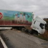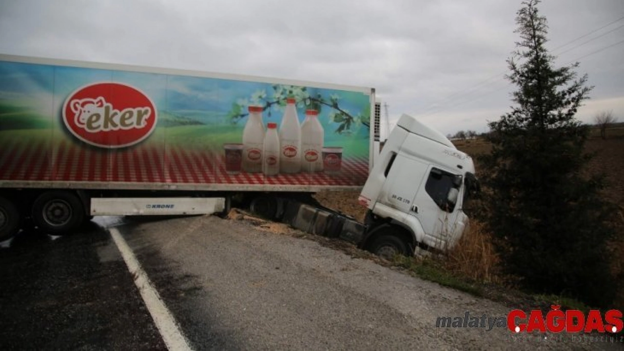 Manisa’da aşırı yağışın etkisiyle kontrolden çıkan tır şarampole devrildi.