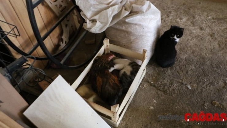 Marangoz ustası Serkan Sevingen, atölyesinde tavuk ve horozların bulunduğunu bunun yanında ayrı ayrı iki tane kediyi sahiplendiğini söyleyerek, tavukların yanına aldığı başka horozun onlarla geçinemeyince kedilerle dostluk kurduğunu söyledi.