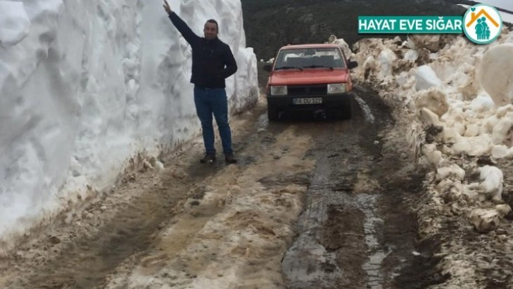 Sivas'ın Doğanşar ilçesi Tikenli yaylasında yaklaşık 2.5 metreyi bulan kar kütlesi görenleri şaşırttı