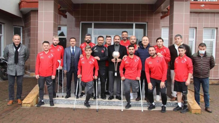 Avrupa Şampiyonası finalinde İspanya'yı 6-0 yenerek üst üste ikinci kez şampiyon olan Ampute Futbol Milli Takımı'nda Teknik Direktör Osman Çakmak ve futbolcular Sivasspor Kulübü'nü ziyaret etti.