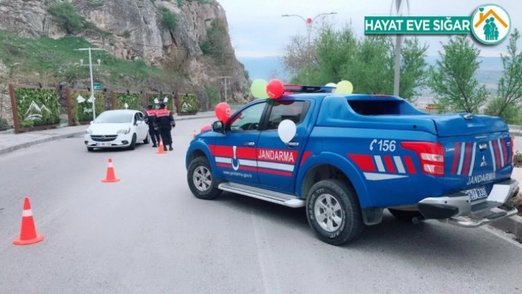 Elazığ'da jandarma personeli araçlarını süsleyerek uygulamaya çıkarken, köylerde çocuklara bayrak ve balon dağıtarak sevindirdi.