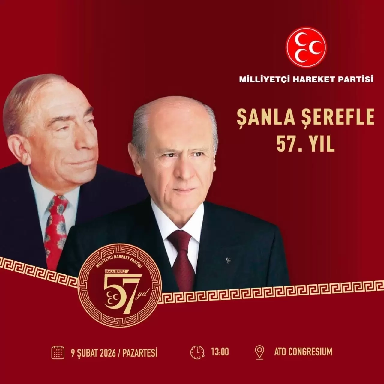 Milliyetçi Hareket Partisi’nin 57. kuruluş yılı etkinliği, 9 Şubat günü saat 13.00’te Ankara ATO Congresium’da gerçekleştirilecek. Program, “Şanla Şerefle 57. Yıl” temasıyla düzenlenecek.