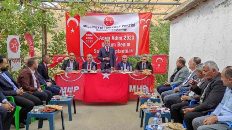 MHP, 8 Ekim’de “Adım Adım 2023; ‘Köyüm Benim’ Sohbet Toplantıları’na başladı. “Köyüm Benim" temalı sohbet toplantıları dahilinde Batman’ın Sason ilçesine bağlı dağ köylerinde vatandaşlarla bir araya gelen MHP heyeti, Cumhur İttifakı’nın yaptığı çalışmaları anlattı. MHP Mersin Milletvekili Baki Şimşek, Cumhur İttifakı’nın dünya coğrafyası üzerinde bulunan mazlumların umudu olduğunu ifade etti. Şimşek, “Biz il il dolaşarak Cumhur İttifakı’nın neler yaptığını vatandaşlarımıza anlattık. Ardından ilçeleri, şimdi de köylerimizi dolaşarak memleketin her karışında yaşayan vatandaşlarımıza ulaşmayı hedefliyoruz. Cumhur İttifakı, Türkiye’nin Kuzey Irak’ta Suriye’de Fırat Kalkanı, Barış Pınarı Harekatı, Zeytin Dalı Harekatı’nı başarıyla yapmasıdır. 46 yıldır kapalı olan Maraş’ın açılması, mavi vatanda şanlı bir mücadelenin verilmesi, birilerinin müze olsun demesine rağmen Ayasofya’nın tekrar İslam aleminin ibadetine açılmasıdır. Cumhur İttifakı, 30 yıllık Ermenilerin Karabağ’daki işgaline son verilmesidir. Cumhur İttifakı, Karadeniz’in binlerce derinliğinden gaz çıkartılmasıdır. Verilen mücadele 85 milyon vatandaşımızın mücadelesidir. Dünyadaki bütün mazlumların mücadelesidir. Adayımız net, kararımız da nettir. Adayımız da Cumhurbaşkanımız Recep Tayyip Erdoğan’dır" dedi.