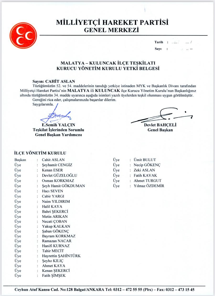 MHP KULUNCAK İLÇE BAŞKANLIĞINA ATANAN CAHİT ASLAN'IN YÖNETİM KURULU LİSTESİ;