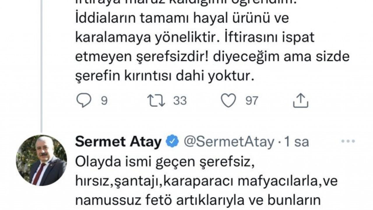 FETÖ artığı firari bir ahlaksızın senaryosunda iftiraya maruz kaldığını aktaran milletvekili Sermet Atay paylaşımlarında, “İddiaların tamamı hayal ürünü ve karalamaya yöneliktir. İftirasını ispat etmeyen şerefsizdir diyeceğim ama sizde şerefin kırıntısı dahi yoktur. Olayda ismi geçen şerefsiz, hırsız, şantajcı, kara paracı mafyacılarla ve namussuz FETÖ artıklarıyla ve bunların perde arkası haysiyetsiz destekçileri ile mücadelemiz Gaziantep bu pisliklerden temizleninceye kadar devam edecektir. Kamuoyuna saygı ile duyurulur” ifadelerini kullandı.