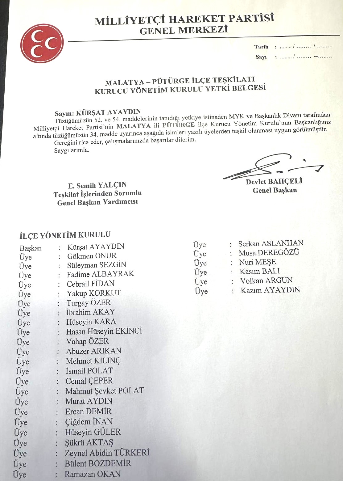 MHP PÜTÜRGE İLÇE BAŞKANLIĞINA ATANAN KÜRŞAT AYAYDININ YÖNETİM KURULU LİSTESİ;