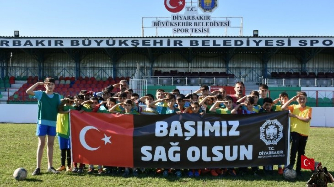 Diyarbakır Büyükşehir Belediyesi Gençlik ve Spor Hizmetleri Dairesi Başkanlığı’nın spor kurslarında eğitim gören minik sporcular ve antrenörleri, Suriye’nin İdlib bölgesinde 34 askerin şehit olduğu saldırılara tepki göstermek için Türk bayraklı “Başımız sağ olsun” pankartı açıp asker selamı verdi. Gençlik ve Spor Hizmetleri Daire Başkanlığı bünyesinde çocuklara yönelik açılan kurslarda eğitim alan minik sporcular, Diyarbakır Büyükşehir Belediyesi Gençlik ve Spor Hizmetleri Dairesi Başkanlığı’na bağlı tesislerde Mehmetçiğe selam göndererek şehitler için dualar okudu.