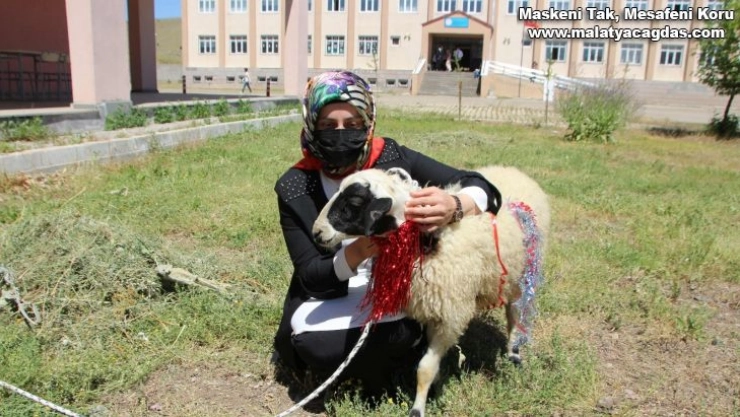 Muş'un Varto ilçesindeki köy muhtarları, başarılı olan Hamurpet İmam Hatip Ortaokulu 8. sınıf öğrencisi Rozerin Akçiçek'e kuzu hediye ettiler.