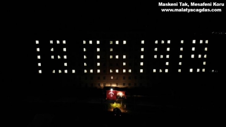 Muş'ta 19 Mayıs Atatürk'ü Anma Gençlik ve Spor Bayramı münasebetiyle, KYK yurdu pencere ışıklarıyla '19.05.1919' yazılıp, dev Türk bayrağı ve Atatürk'ün fotoğrafının yer aldığı bayrakla koreografi oluşturuldu.